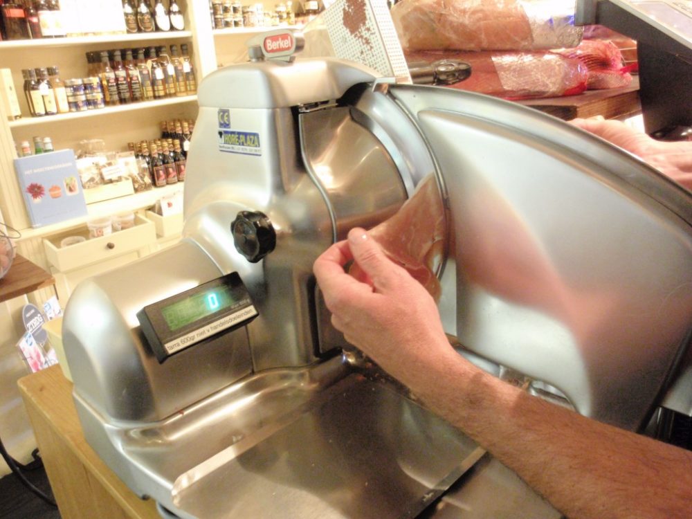 Als lekkernij proeven we een overheerlijke Parmaham en vervolgens een Ibericoham. We krijgen nog de tip mee om in Spanje niet over Pata Negra te beginnen, want dat is volgens Edwin gewoon de poot van een varken. De kunst zit niet alleen in de selectie van de vleessoorten, maar ook in het snijden. En dat blijkt inderdaad best lastig. Doordat er niet voor de standaard ‘platgeslagen’ ham gekozen wordt, maar voor de bollere variant waar meer vocht in zit en daardoor ook meer smaak is het moeilijk om de ham mooi te snijden. Peek kan het als geen ander en als het dan ook nog op een mooi wit vel terechtkomt, zodat we geheel in stijl huiswaarts kunnen, hebben wij niks meer te klagen.
