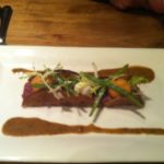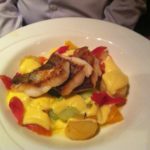 Wij kiezen voor de tartaar van ossenhaas en gevulde vissoep (op de kaart een tussengerecht). De steak tartaar wordt tegenwoordig in diverse varianten opgediend. Ook deze versie wijkt sterk af van de klassieker. Het vlees ligt in een krokant soort schelp, daarboven op bitterbal met parmaham en een gepocheerd kwarteleitje. Het gerecht wordt afgemaakt met truffeldressing. Het blijkt een voortreffelijke start van deze avond.