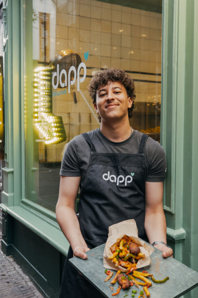 Dapp Frietwinkel opende in 2014 in de Vinkenburgstraat. Later volgde een tweede locatie in Leiden. Formulemanager Luuk vindt het mooi om te zien dat er nog steeds gasten van het eerste uur langskomen. “Zo komt Frans iedere vrijdag nog steeds een klein frietje mayo halen.”