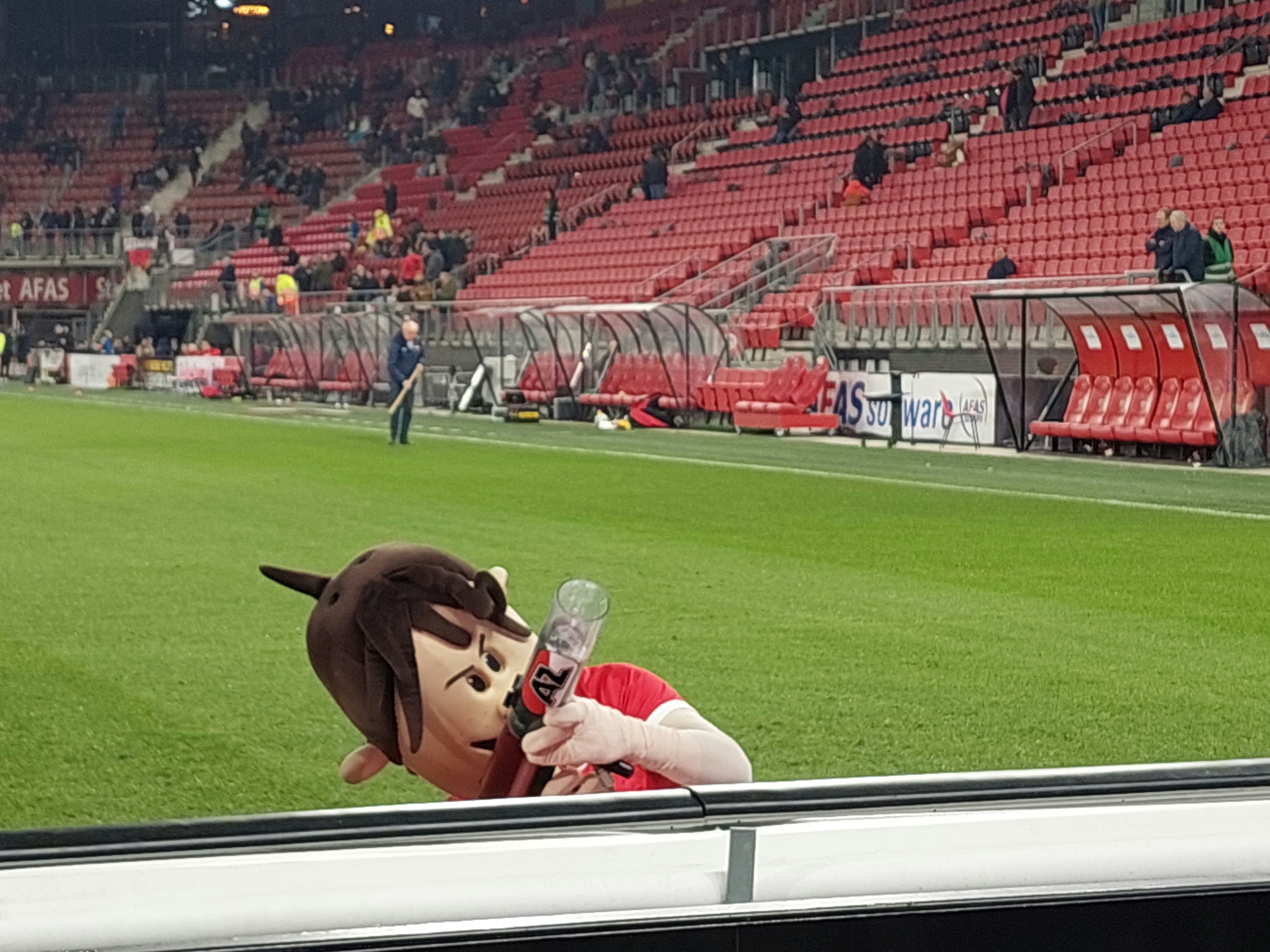 De vele files zorgden er namelijk voor dat wij 10 minuten te laat in het stadion arriveerden, maar uiteindelijk konden we plaatsnemen in vak J. Voor de oudgedienden in de Galgenwaard een memorabel vak. Het stadion was matig bezet, maar het bezoekersvak was uitverkocht. De eerste helft had veel weg van een tactisch schaakspel. Beide teams waren aan elkaar gewaagd. Al had AZ wel een licht overwicht. De beide spitsen Douvikas en Pavlidis werden goed verdedigd. De 0 – 0 was dan ook een logisch gevolg in de rust. In diezelfde rust had de mascotte zijn vizier niet op scherp, waardoor hij mij volledig miste.
