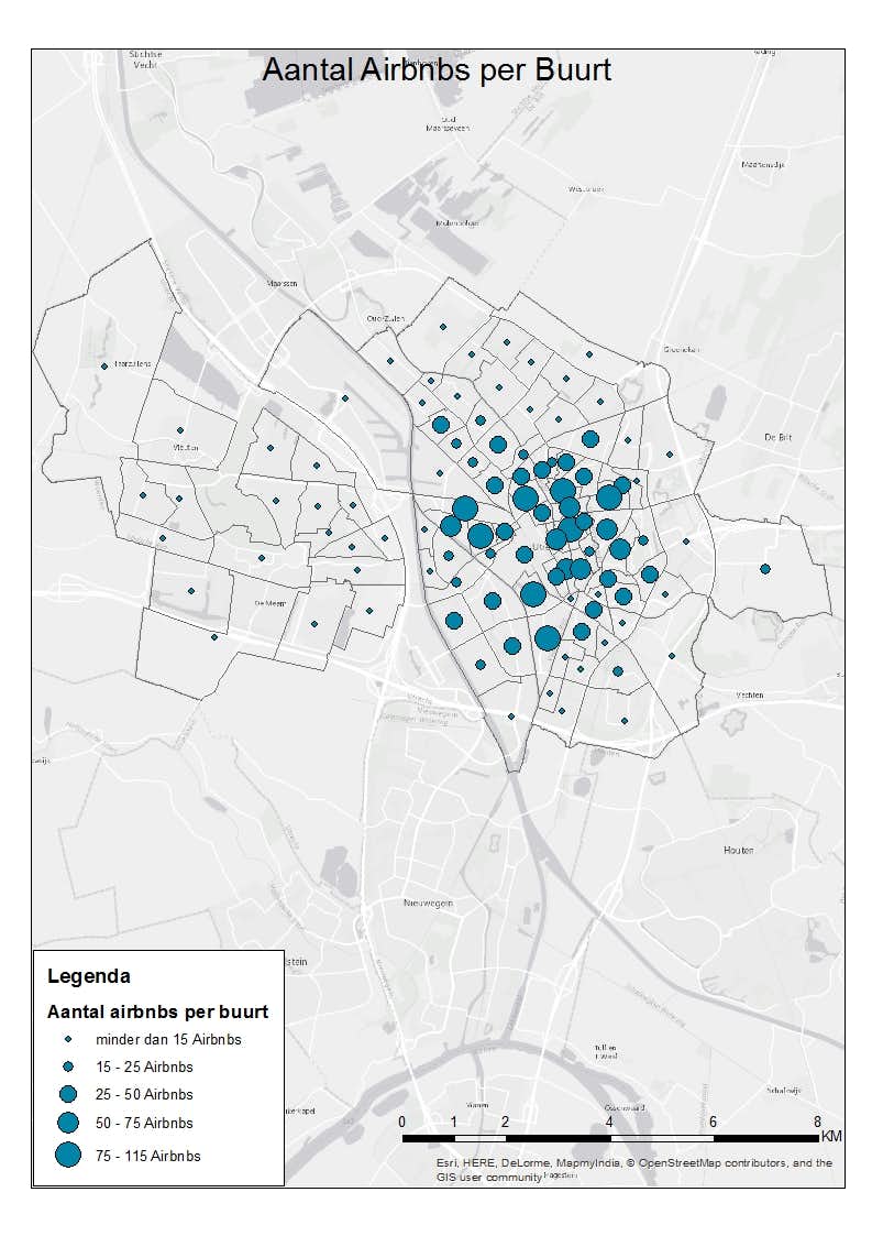 In Utrecht is het aanbod van woningen voor tijdelijk vakantieverhuur sterk gegroeid. Analyses van het aanbod en gebruik van woningen via Airbnb* laat zien dat er tussen juni 2011 en augustus 2016 2582 kamers en hele woningen werden aangeboden. Een sterke piek in de groei van het aanbod was te zien rondom de ‘Grand Départ’ van de Tour de France. In de periode augustus 2015 tot augustus 2016 werd overigens maar de helft van het aantal accommodaties (1202) aangeboden op Airbnb en werden er in totaal 41.000 nachten geboekt. Dit is naar schatting goed voor zo’n 10% van de totale toeristische overnachtingen in Utrecht. Zo’n 15% van de aangeboden accommodaties ligt in de binnenstad van Utrecht, binnen de singels. Voor een overzicht zie het bijgaande kaartje.