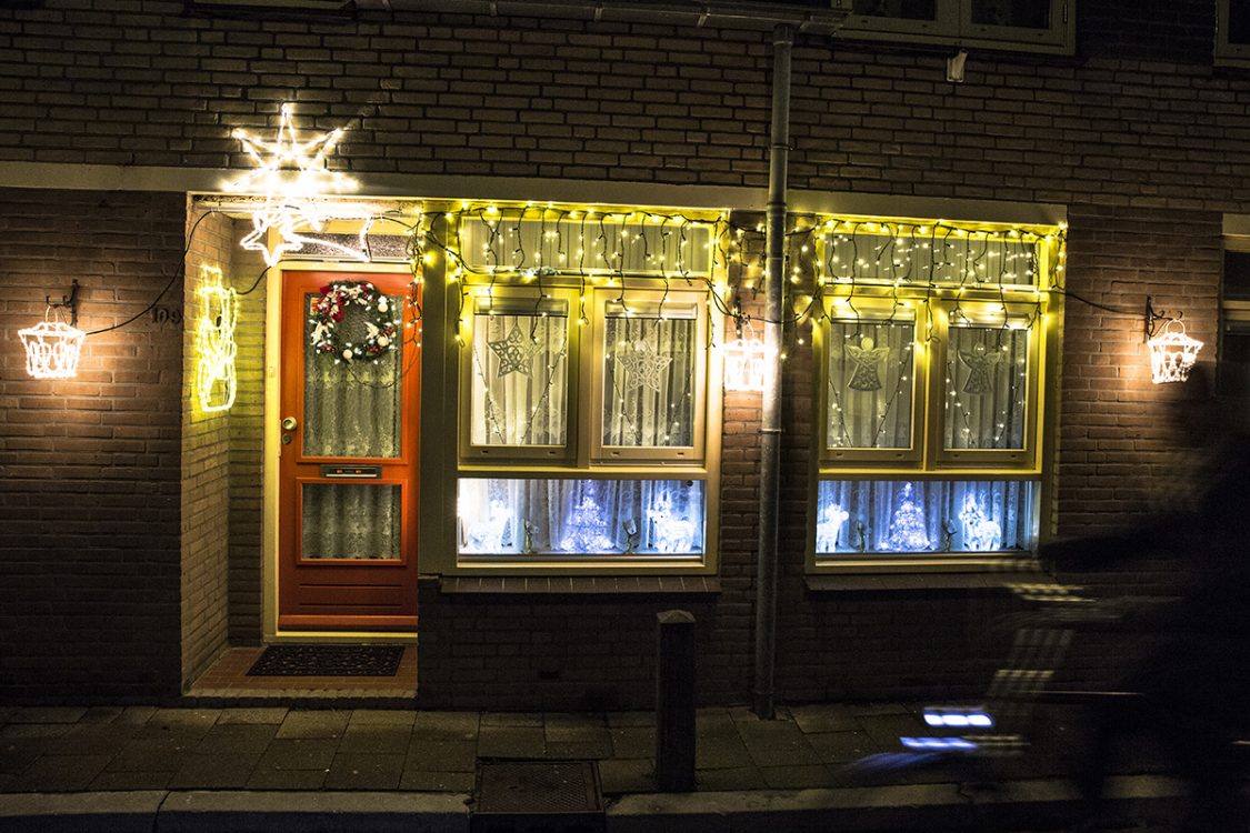 Pet: “Dit is het laatste jaar dat we dit doen; er is geen animo meer in de straat. We zijn de enigen met kerstverlichting. Dat was 25 jaar geleden eigenlijk ook al zo, toen we begonnen. Ik vond zo’n kale straat zo ongezellig. Dus kocht ik een paar lampies. In de loop der jaren kwamen er steeds meer bij. Ik vind het fijn om zo’n helder licht voor het raam te hebben in deze tijd van het jaar. Alleen witte verlichting. Dat vind ik prachtig. Als ik ’s ochtends beneden kom, werk ik direct mijn ritueeltje af: ik zet eerst de verlichting van de kerstboom aan en direct daarna de schakelaar van de buitenverlichting. Gezellig.”