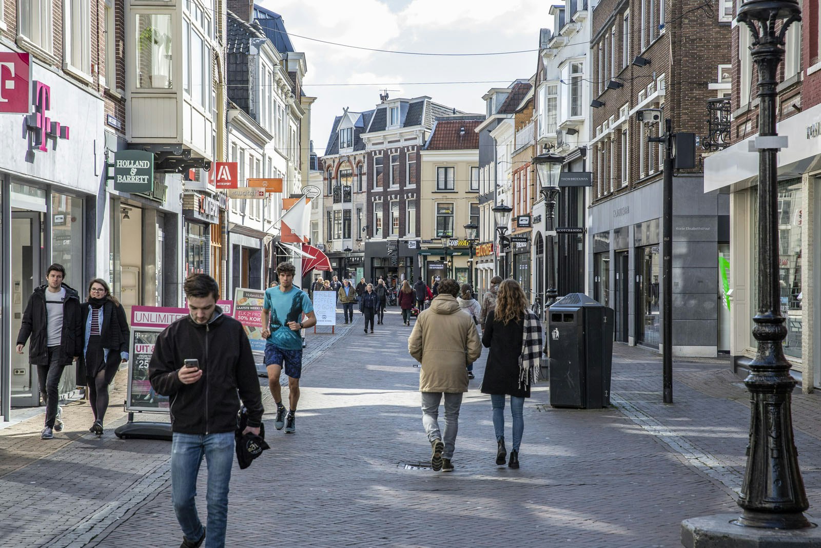 Een zonnige zaterdagmiddag in maart is onder normale omstandigheden in het centrum van Utrecht het recept voor volle terrassen en drukke winkelstraten. Zaterdag 28 maart is echter de eerste zaterdag nadat veel zaken zijn gesloten door de coronacrisis, waardoor de binnenstad er stilletje bij ligt.