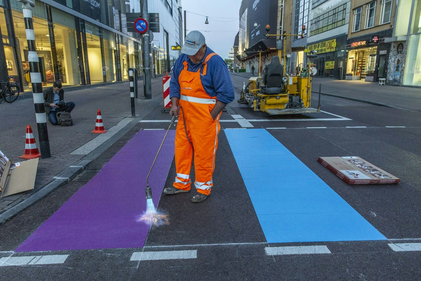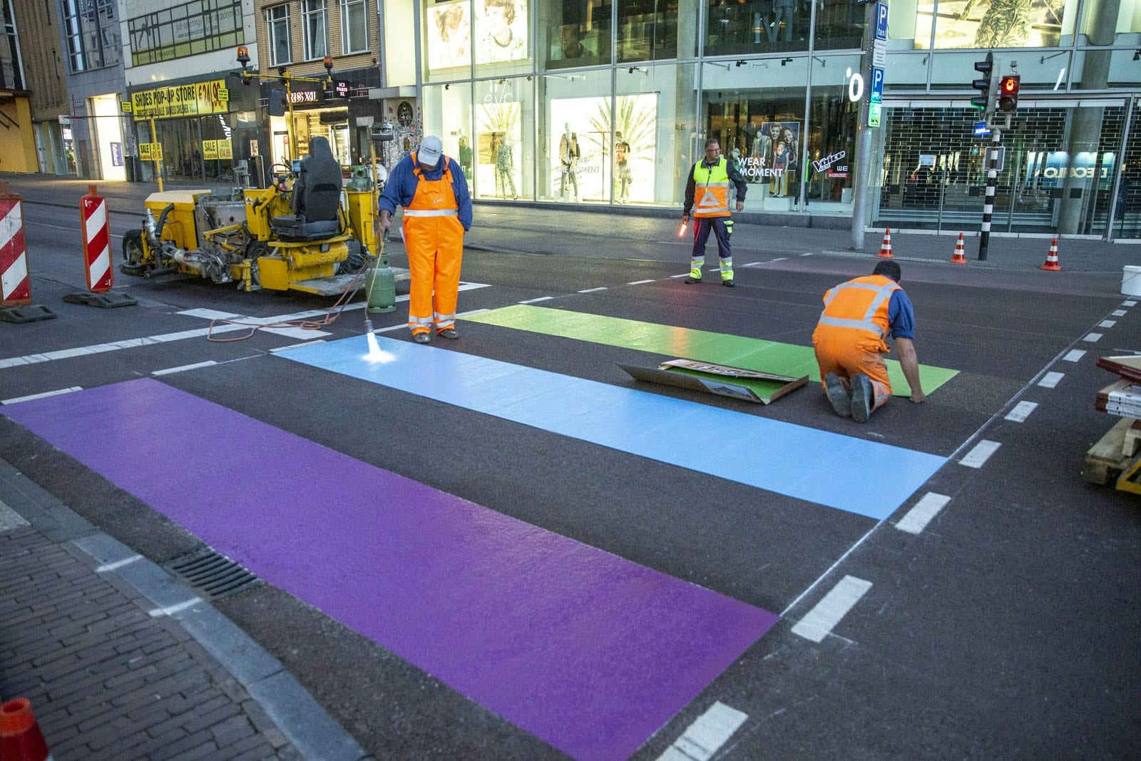 Het regenboogzebrapad in de Lange Viestraat in Utrecht is weer in ere hersteld. Vanwege herstelwerkzaamheden aan het asfalt was de kleurrijke oversteekplaats tijdelijk weg.