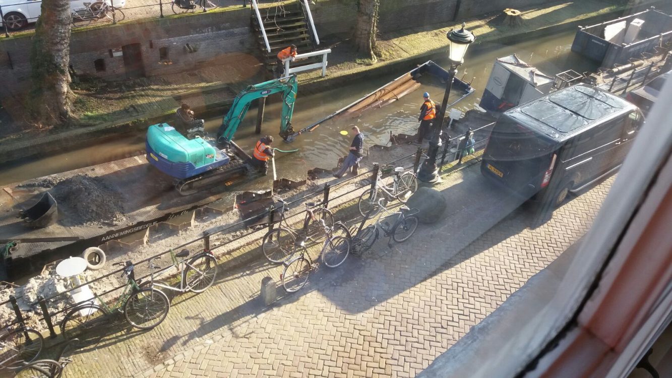 Een laadbak vol met bouwmateriaal is gezonken in de Nieuwegracht in Utrecht. Het gevaarte met metalen buizen verdween vanochtend onder water. Hoe dat kon gebeuren is niet duidelijk.