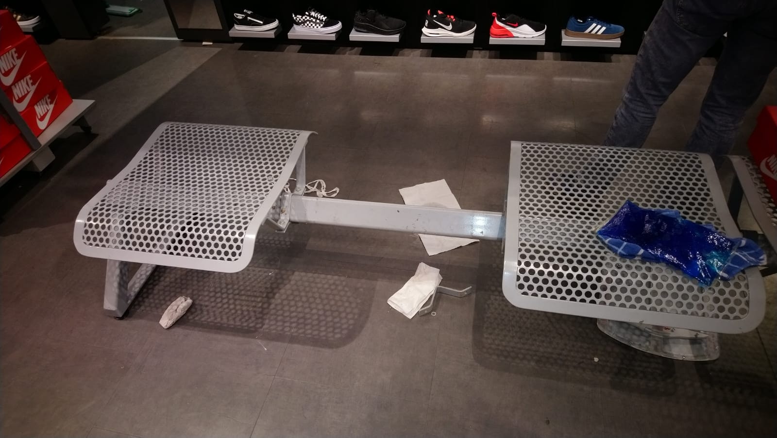 Is dit wel het juiste bankje? Is dit soms een nep- oftewel fakebankje? Ik zie helemaal geen zaagsporen. Wel allerlei rommel eronder. Of hebben een lasser en een schilder het meteen weer gerepareerd? En mochten die toen ook een paar schoenen uitzoeken? En al die gaatjes moeten nu wel verkleind worden. Wie biedt zich aan voor dit geduldwerkje?