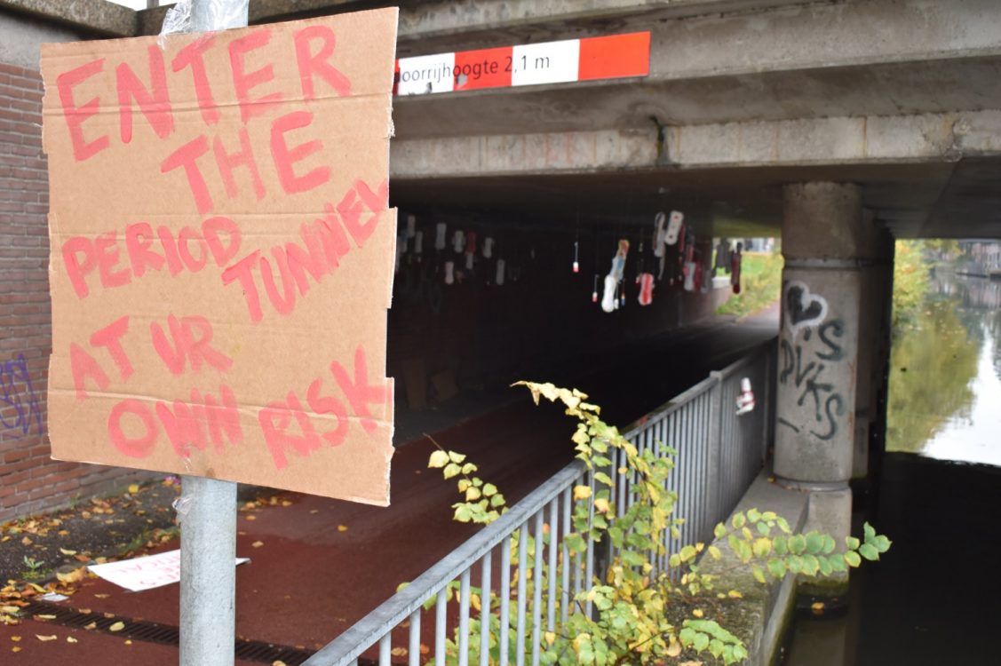 Bij aankomst van de onderdoorgang word je al gewaarschuwd: ‘Enter the period tunnel at ur own risk’, staat er in grote rode letters. Onder de brug zelf hangen maandverbanden en tampons, rijkelijk versierd met glitters en tekeningen. Op een aantal staan teksten; Engelstalige quotes. Van wie, is niet duidelijk.