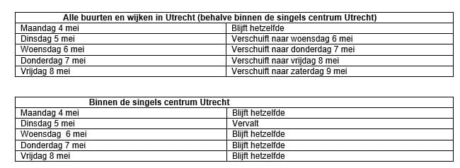 Op Bevrijdingsdag (dinsdag 5 mei) haalt de gemeente Utrecht geen afval huis-aan-huis op. Daardoor verandert in de meeste buurten het ophaalrooster van al het afval dat we huis-aan-huis ophalen. Dit geldt dus voor restafval, groente,- fruit- en tuinafval, papier en karton en voor plastic, blik en pak.