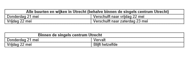 Op Hemelvaartsdag (donderdag 21 mei) haalt de gemeente Utrecht geen afval huis-aan-huis op. Daardoor verandert in de meeste buurten het ophaalrooster van al het afval dat huis-aan-huis wordt opgehaald. Dit geldt dus voor restafval, groente,- fruit- en tuinafval, papier en karton en voor plastic, blik en pak.