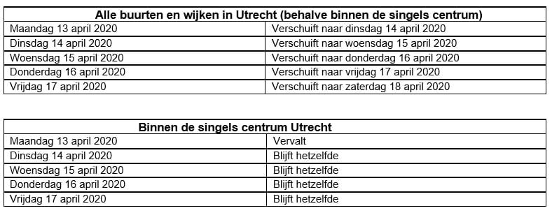Vanwege tweede paasdag (maandag 13 april) wijzigt het ophaalrooster van het afval in Utrecht dat huis-aan-huis wordt opgehaald. Dit verandert voor al het afval. Dus voor restafval, groente,- fruit- en tuinafval, papier en karton en voor plastic, blik en pak.