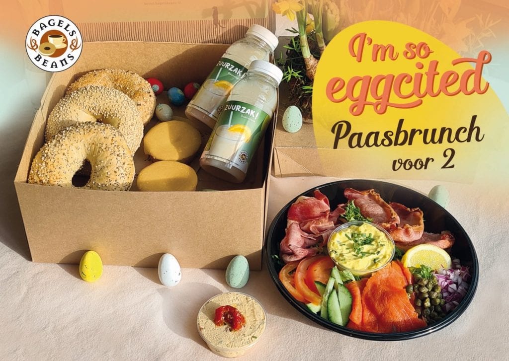 Heb je ook zin om met de paasdagen uitgebreid te ontbijten of te brunchen? Wij hebben een Paasbox voor 2, gevuld met EGGciting Bagels & Beans producten. 3 Bagels die je naar hartenlust kunt beleggen met eiersalade, zalm, beenham, bacon, creamcheese en verschillende soorten toppings. 2 Flesjes zuurzak en als toetje 2 gele koeken (vegan). De box is makkelijk online te bestellen via bestel.bagelsbeans.nl bij een vestiging bij jou in de buurt (Amsterdamsestraatweg 302, Biltstraat 60, Catharijne Esplanade 10, Haroekoeplein 35, Hof van Bern 8 en Mariaplaats 48).