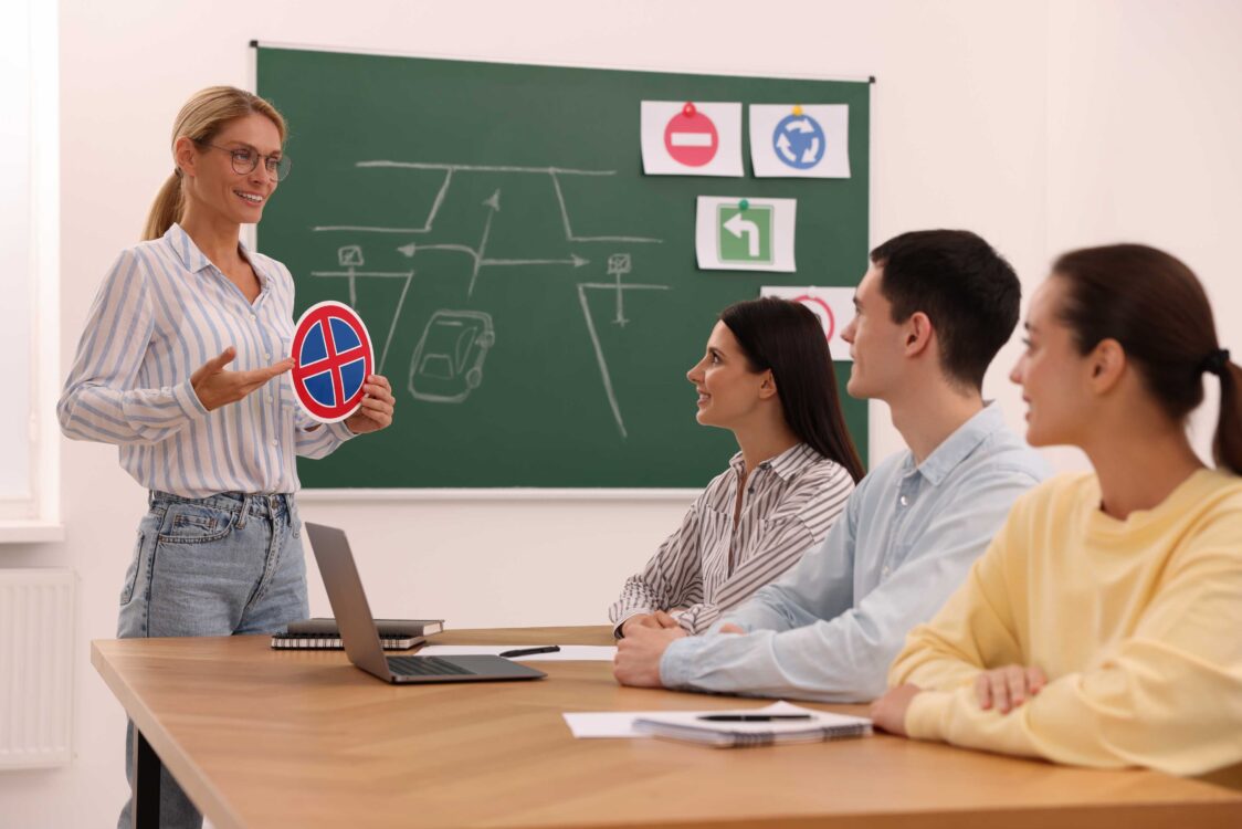 De cursusdag begint vroeg, vaak rond zeven uur in de ochtend. Je start met de belangrijkste verkeersregels en verkeersborden, uitgelegd door een ervaren docent die weet hoe je de stof snel begrijpt en onthoudt. Alles draait om herkenning: in plaats van droge theorie worden voorbeelden uit de praktijk gebruikt, zodat je situaties beter leert inschatten. Door actief mee te doen, blijft de aandacht de hele dag scherp.
