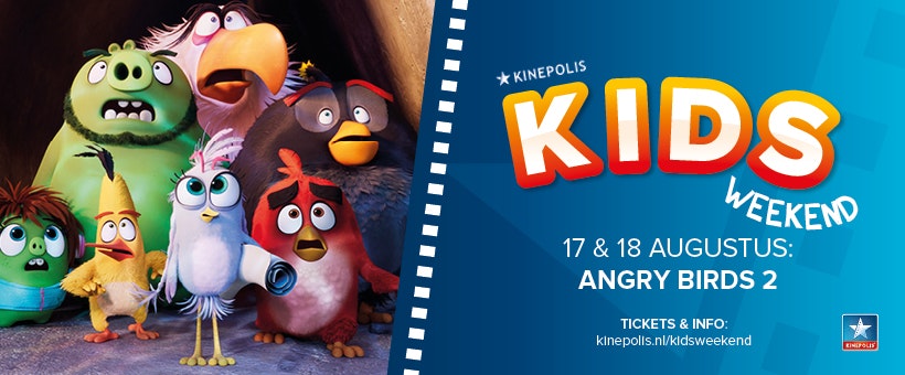 Wil je als een van de eersten van Nederland de Angry Birds 2 zien? Kom dan tijdens het Kids Weekend op 17 en 18 augustus de voorpremière van de film bekijken. Extra lol beleef je die dagen met speciale Angry Bird-activiteiten zoals een stormbaan en Angry Bird Photobooth! Je smult van een gratis ijsje èn je kunt op de foto met levensgrote characters uit de film. Koop vliegensvlug je tickets! want dit wil je toch niet missen?