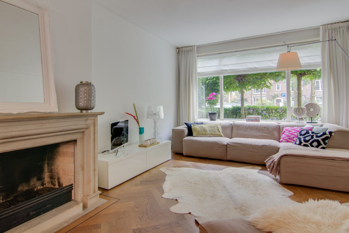 Beneden is een ruim opgezette woonkamer met veel ramen waardoor het lekker licht is. Ook beschikt de woning over een achtertuin die door middel van twee grote openslaande deuren makkelijk te betreden is. De woning kent van origine zes slaapkamers, maar doordat er niet zoveel kinderen in het gezin van Hooiveld zijn is er besloten om van vier slaapkamers twee grote slaapkamers te maken. Dit is nog wel makkelijk te herstellen, mocht dat gewenst zijn.
