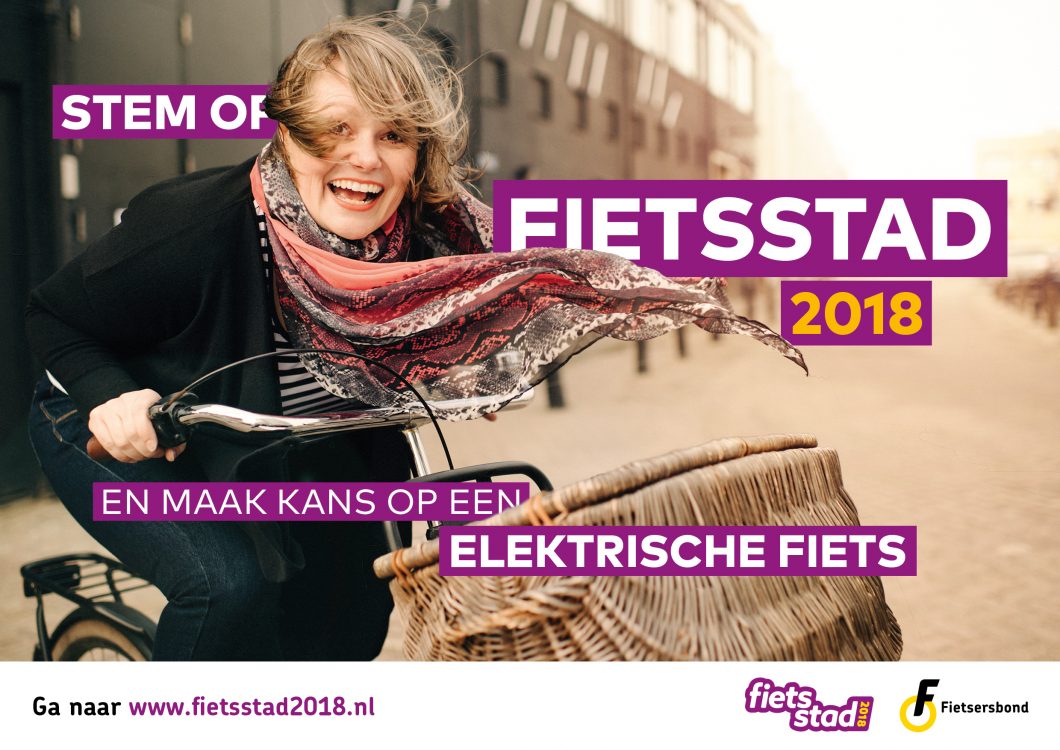 De Fietsersbond organiseert ‘Fietsstad2018’, een landelijke verkiezing waarbij fietsers gevraagd wordt naar hun ervaring met het fietsen in hun eigen stad. U kunt nog tot 31 mei uw stem laten horen op fietsstad2018.nl. Zo draagt u niet alleen bij aan een beter fietsklimaat, maar maakt u ook nog eens kans om een elektrische fiets te winnen!
