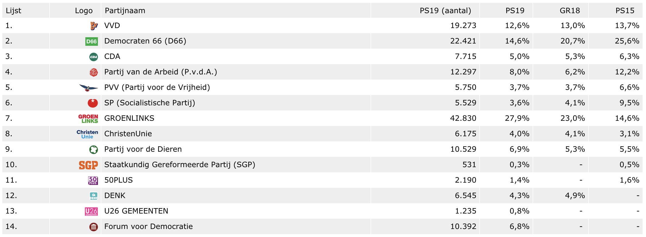 De uitslag per partij in de stad vergeleken met de gemeenteraadsverkiezingen en provinciale statenverkiezing in 2015