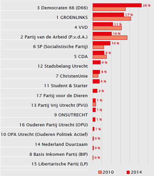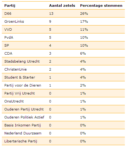 Op Ufuk Dogeries gezicht was duidelijk teleurstelling te zien toen de uitslag bekend werd gemaakt. Zijn partij, OnsUtrecht, leek een zetel te gaan halen, maar hij ging uiteindelijk zonder iets naar huis. De lijsttrekker van Ouderen Partij Utrecht, Okke Snieders, had er voor de voorlopige einduitslag al geen vertrouwen meer in en besloot deze dan ook niet in het stadhuis, maar thuis af te wachten. Er klonk luid gejuich uit de zaal toen bleek dat de Partij Vrij Utrecht van Wim Vreeswijk geen stemmen had behaald.