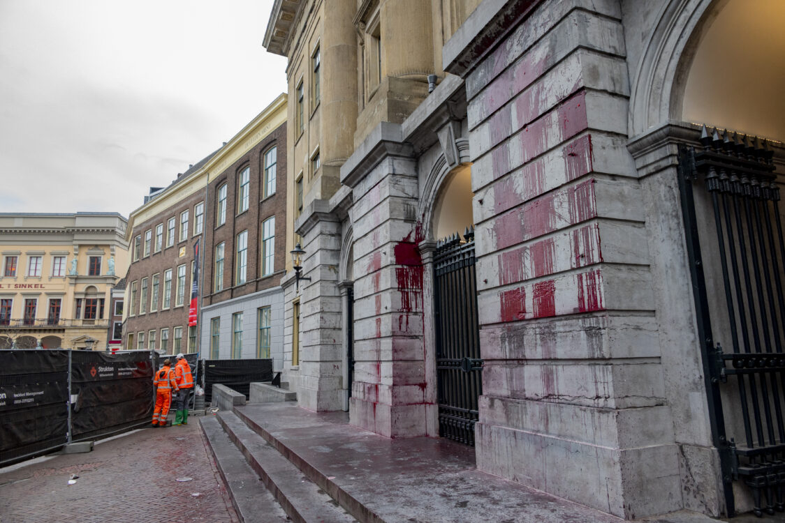 Op de Stadhuisbrug staan bouwhekken met zwarte doeken rondom de gevel van het stadhuis. Voorbijgangers kijken nieuwsgierig tussen de hekken door en maken foto’s van de bekladdingen. Ondertussen zijn de schoonmakers druk bezig de verf van de muren, pilaren en trap af te halen.