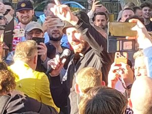 Na een maaltijd op het fanplein besloten we mee te lopen met de fanwalk. Wat een mooie belevenis. En opvallend: geen enkel vuurwerk of incident. De plaatselijke roeivereniging kreeg op de route mondelinge steun van fans van FC Utrecht tijdens hun training. Ze konden het wel waarderen.