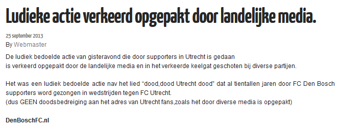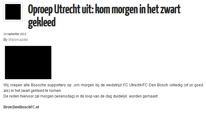 De tweets “Spandoek,doodskist en dode bloemen, de groeten uit Den Bosch. Dood dood Utrecht dood” en “Door de actie van vannacht vragen wij alle supporters om zich vanavond gepast (in het zwart) te kleden” van de Bosche fanclub zijn inmiddels verwijderd en ook het bericht waar in bovenstaand bericht naar verwezen wordt is van de site gehaald. De oproep om tijdens de wedstrijd van vanavond zwart te dragen staat echter nog wel op de site.