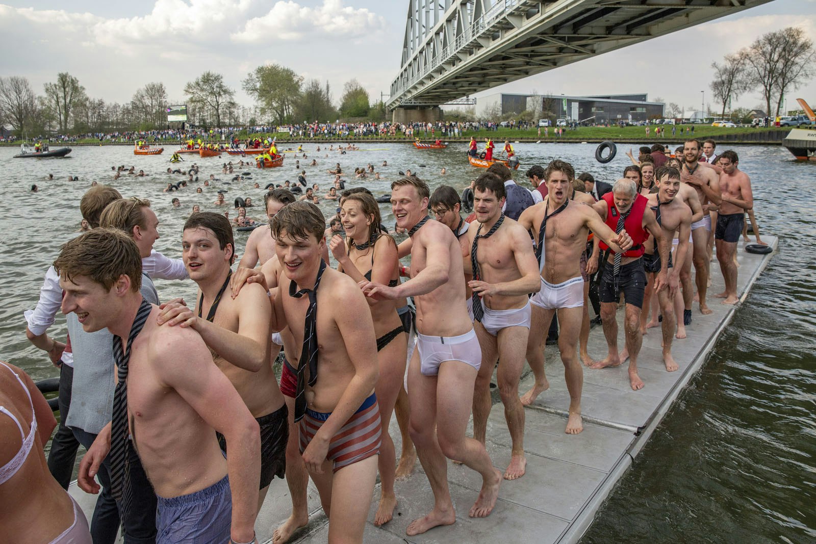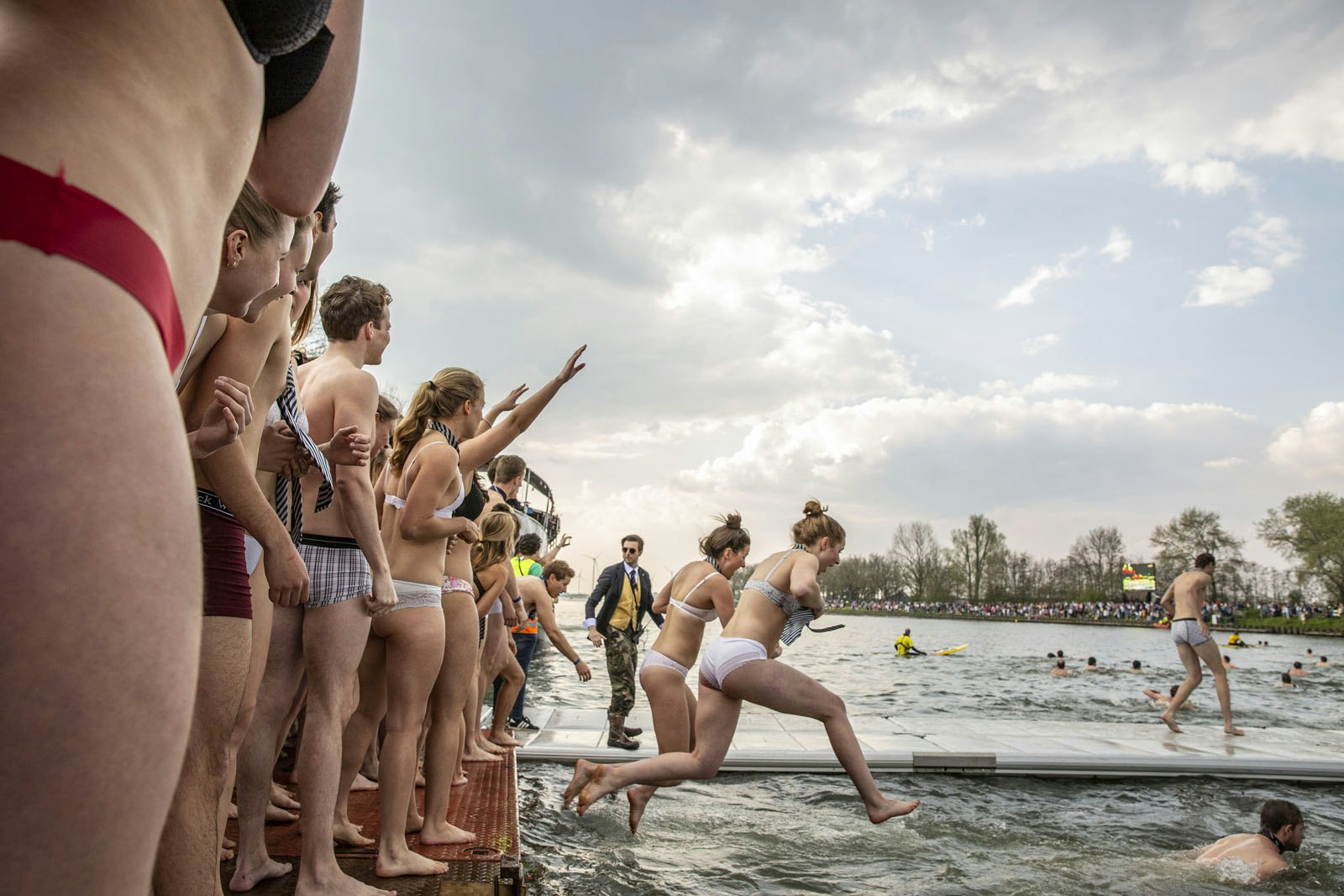 Traditioneel sprongen zowel toeschouwers als deelnemers na het koningsnummer in het water om naar de roeiers in de boten te zwemmen.
