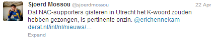 “Dit bericht werd vervolgens honderden keren geretweet, waarna het in het begin van de avond ook bij NAC-supporters aanbelandde. Inmiddels is het bij meerdere NAC-supporters, verdeeld over het vak, nagevraagd. Allen reageren bevestigend: Nee, NAC-supporters zijn niet verbaal over de schreef gegaan zondag. Ook de fotografen die de hele wedstrijd onder het vak hebben gezeten hebben niets gehoord,” is de supportersvereniging stellig.