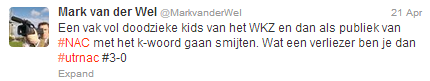 NAC Breda eist rectificatie van FC Utrecht van de beschuldiging dat zondagmiddag spreekkoren met de kreet ‘Kanker-Utrecht’ vanuit het uitvak te horen waren. De speaker zei hier tijdens de wedstrijd wat van, waarna de NAC-supporters via sociale media de volle laag kregen. De spreekkoren waren extra pijnlijk, omdat er 450 patiëntjes van het WKZ op de tribunes zaten.