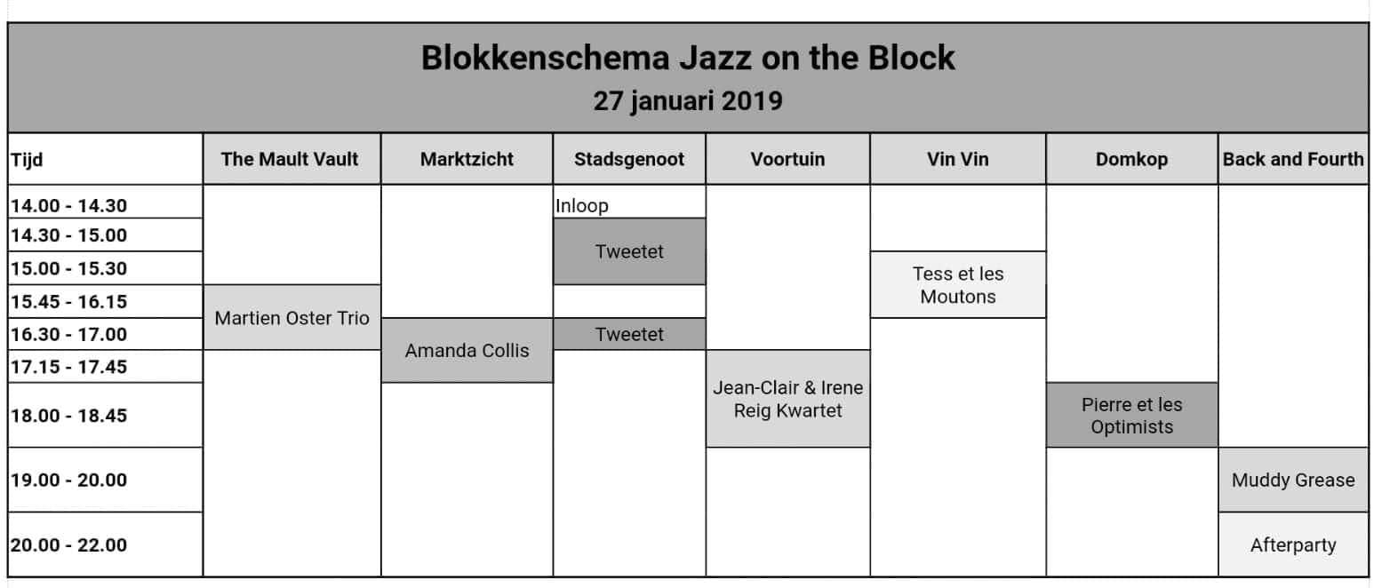 Na een succesvolle editie in 2018 wordt er vandaag voor de tweede keer Jazz On The Block georganiseerd. Het initiatief komt van een aantal horeca-ondernemers rondom de Breedstraat en je kunt vandaag dan ook bij meerdere van hen terecht om van zeven bands te genieten. Zowel onbekender talent als gevestigde namen komen voorbij.