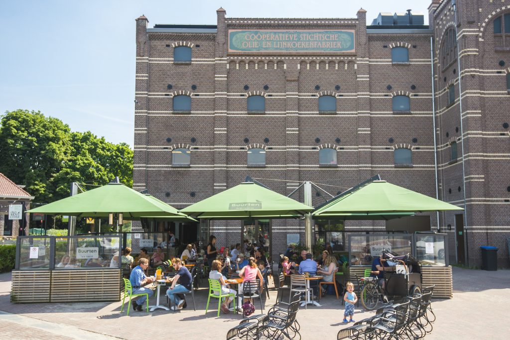 Veel yuppen met jonge kinderen weten het terras al goed te vinden, maar ook voor andere Utrechters is dit een absolute aanrader. De omgeving van het terras is prachtig groen en door de heg mooi afgesloten van de rest van de omgeving. Je kijkt uit op de Muntkade en daarnaast is het een mooi plekje om te kijken naar het langsfietsende publiek. Heerlijk in de zon op het grote terras van een volledig gerenoveerde fabriek; als je dan toch in West bent, breng dan een bezoek aan dit pareltje.
