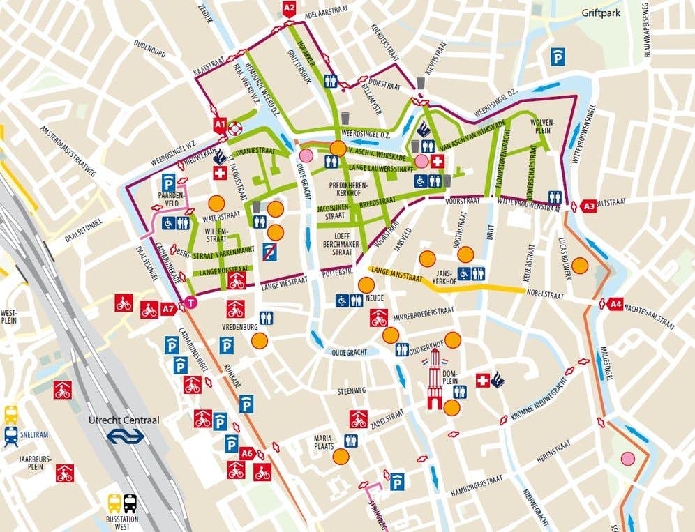 De gemeente heeft een handig overzicht gemaakt van de binnenstad tijdens Koningsnacht- en dag. De vrijmarkt is een autovrij gebied, onderstaand plattegrond geeft duidelijk aan om welke gebieden het gaat. De foodstreet loopt dit jaar weer van het Vredenburg tot aan de Nobelstraat. De commerciële verkopers die van de vrijmarkt worden geweerd, kunnen hier hun eten en drinken verkopen. Ze worden geweerd van de vrijmarkt doordat ze vaak zorgen voor lange rijen en opstoppingen. Op de plattegrond staan verder de pleinen met evenementen, de (kinder)vrijmarkten, toiletten, EHBO-posten, politie-posten en taxistandplaatsen.
