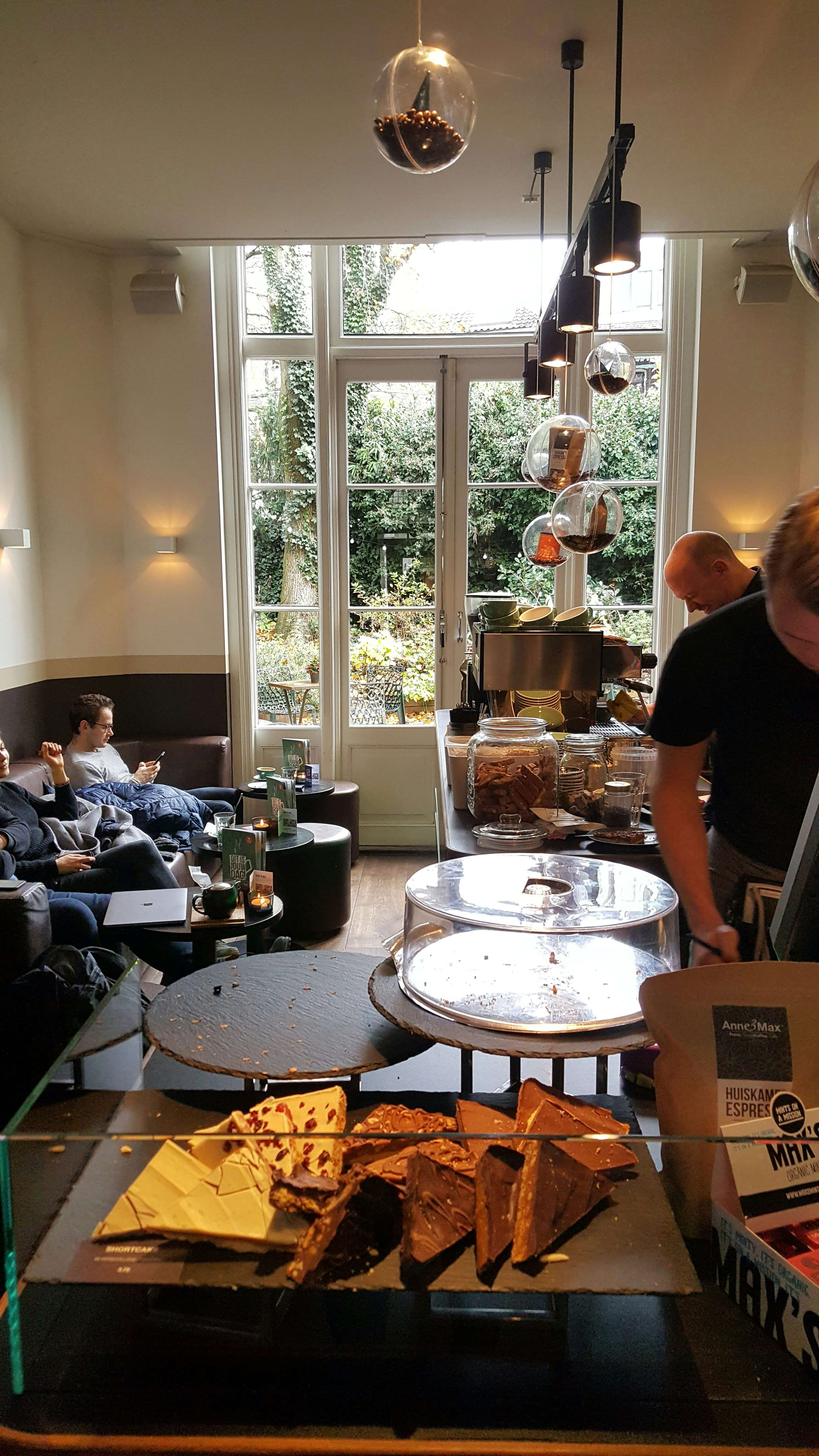 Het huiskamergevoel wordt flink gestimuleerd in Anne&Max. Vanuit de hal kun je drie verschillende ‘kamers’ in, allemaal knus ingericht met boekenkasten, zitjes en schommelstoelen. Ook leidt de hal naar een grote bar waaromheen koffieartikelen, chocola en lekkernijen uitgestald staan. Achter in het pand is een mooie serre die uitkijkt op een ’s zomers toegankelijke tuin.