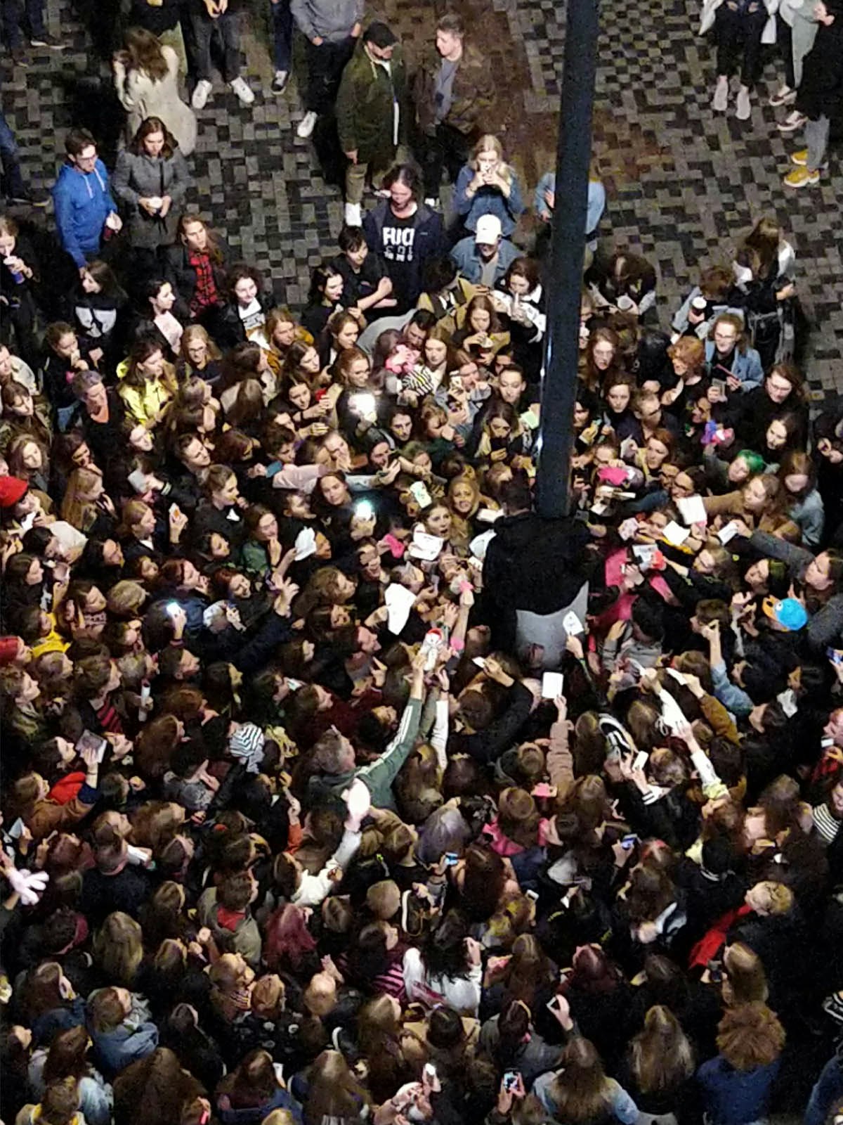De 21-jarige rocksensatie Yungblud heeft na een zinderde uitverkochte show in TivolIVredenburg zijn fans opgezocht op het Vredenburgplein. De Britse ster klom in een lantaarnpaal en deelde handtekeningen uit aan de gillende fans.
