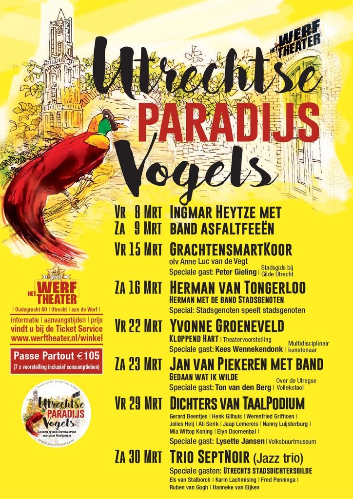Een klein Utregs festival, dat is festival Utrechtse Paradijsvogels in het Werftheater. Tijdens vier weekenden in maart is er een programma van zeven evenementen. Opmerkelijke persoonlijkheden, poëtische vrijheid en betoverende muziek. Van Ingmar Heytze tot Jan van Piekeren, dit festival brengt de sfeer van Utrecht tot leven. Kaartjes zijn los te kopen, maar de echte liefhebbers kunnen ook gaan voor een passe-partout. Op de website van het Werftheater staat wie wanneer precies optreedt.