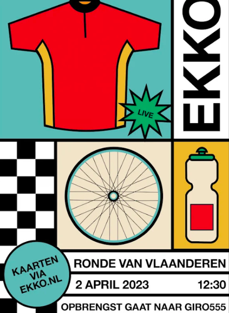 Op de veertiende zondag van het jaar wordt het wielerseizoen pas echt geopend met een van de oudste en mooiste koersen van het jaar: de Ronde van Vlaanderen. In samenwerking met Het is Koers kunnen de echte wielerfans in gezamenlijkheid de koers weer op groot scherm in EKKO bekijken. De liefhebbers kunnen dit doen onder het genot van een Belgisch biertje en daarnaast staan er frieten op het menu, geheel in stijl natuurlijk. Sinds 2012 gaat de opbrengst naar een goed doel en, solidair met de recente acties en ontwikkelingen, gaat de opbrengst dit jaar via Giro 555 naar oorlogsslachtoffers in Oekraïne en de slachtoffers van de aardbevingen in Turkije en Syrië.